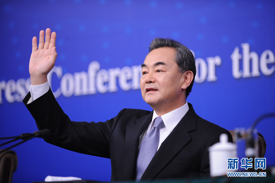 ?? 十二屆全國(guó)人大三次會(huì)議新聞中心于3月8日(星期日)10時(shí)在梅地亞中心多功能廳舉行記者會(huì),邀請(qǐng)外交部部長(zhǎng)王毅就中國(guó)的外交政策和對(duì)外關(guān)系相關(guān)問(wèn)題回答中外記者提問(wèn)。圖為外交部部長(zhǎng)王毅向記者揮手致意。新華網(wǎng)/中國(guó)政府網(wǎng) 翟子赫 攝