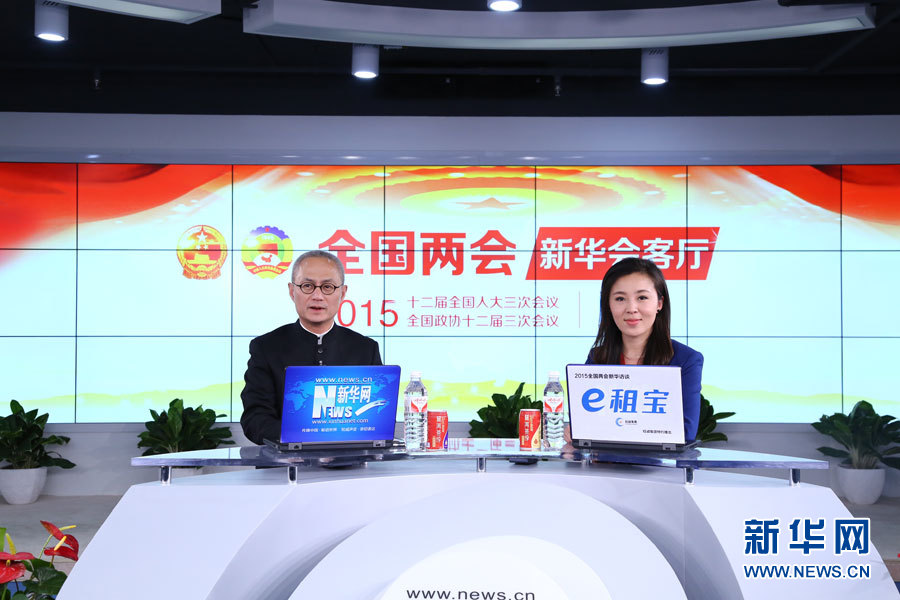??? 2015年3月14日,全國人大代表、鳳凰古城文化旅游投資股份有限公司董事長葉文智做客新華會(huì)客廳。圖為嘉賓與主持人合影。新華網(wǎng) 李江 攝