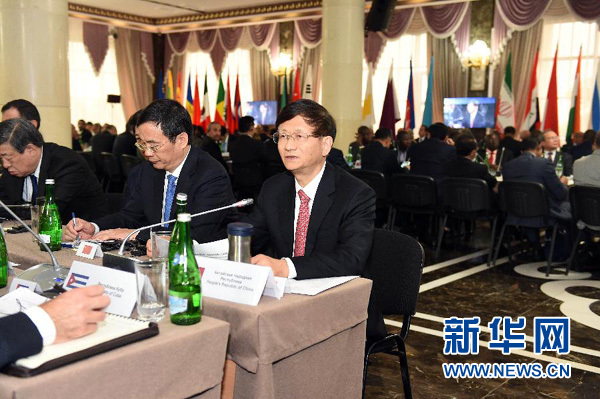 5月24日,在俄羅斯車臣共和國首府格羅茲尼,中共中央政治局委員、中央政法委書記孟建柱(前右一)在第七屆安全事務高級代表國際會議上發言。中共中央政治局委員、中央政法委書記孟建柱24日在俄羅斯車臣出席第七屆安全事務高級代表國際會議。來自70余個國家和國際組織的代表就深化國際安全合作、有效應對恐怖主義等問題進行探討。新華社發(郝帆攝)