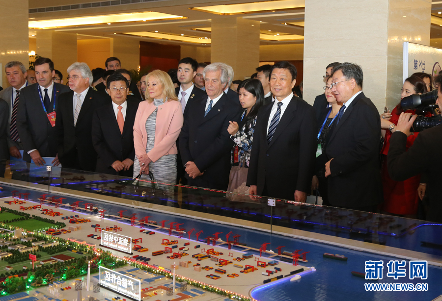 10月14日,中國國家副主席李源潮在河北唐山與參加第十屆中國-拉美企業(yè)家高峰會的烏拉圭總統(tǒng)塔瓦雷·巴斯克斯共同巡視中拉產能合作展覽會。這是李源潮與巴斯克斯參觀曹妃甸產業(yè)園沙盤。新華社記者楊世堯攝