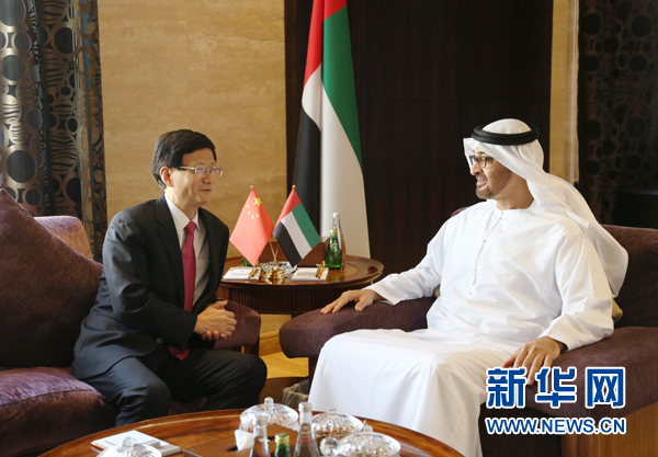 11月7日,在阿聯酋阿布扎比,習近平主席特使、中共中央政治局委員、中央政法委書記孟建柱(左)會見阿聯酋阿布扎比王儲穆罕默德。新華社記者李震攝