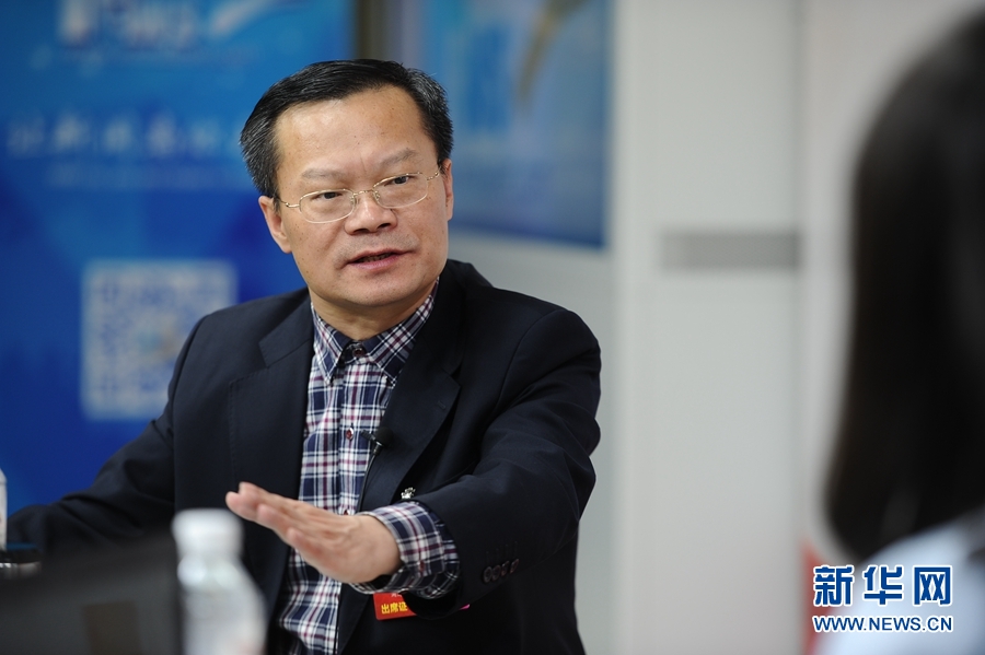 2016年3月14日,全國人大代表、湖南省益陽市委書記胡忠雄做客新華網兩會訪談直播間。圖為胡忠雄在回答主持人提問。新華網 盧志佳 攝