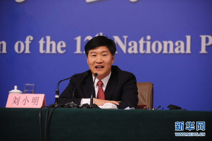 十二屆全國人大四次會議新聞中心于3月14日(星期一)10時在梅地亞中心多功能廳舉行記者會,邀請交通運輸部部長楊傳堂、交通運輸部運輸服務司司長劉小明、北京交通發展研究中心主任郭繼孚就“深化出租汽車改革與發展”的相關問題回答中外記者的提問。圖為交通運輸部運輸服務司司長劉小明答記者問。新華網/中國政府網 陳杰 攝