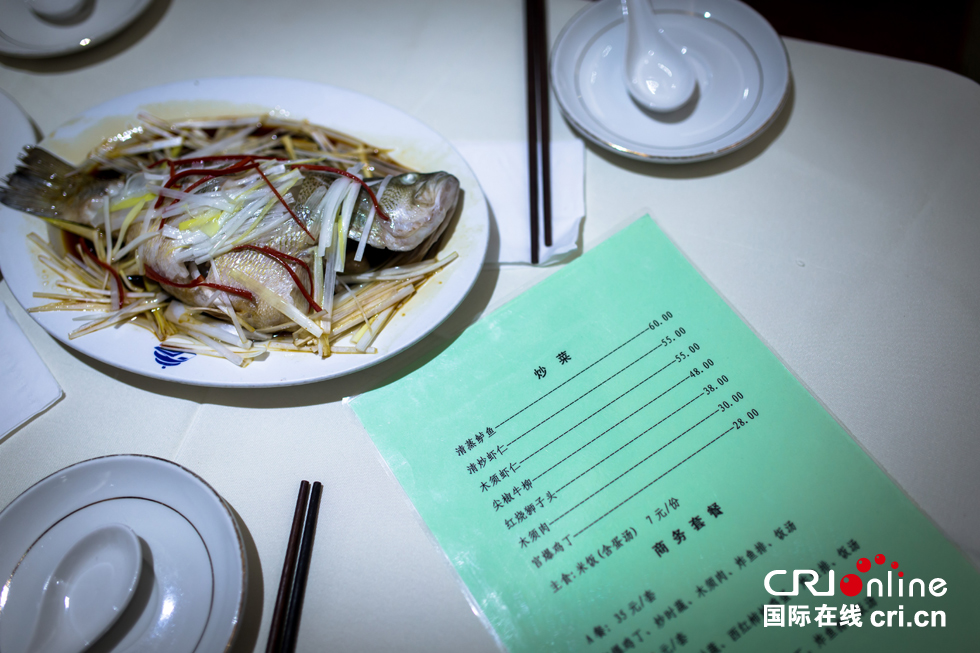 除了點套餐的旅客,還有很多單點菜品。清蒸鱸魚是白師傅的招牌菜之一,因為這道菜也有很多回頭客。圖為白振慶師傅將準備好的鱸魚放到蒸箱中。
