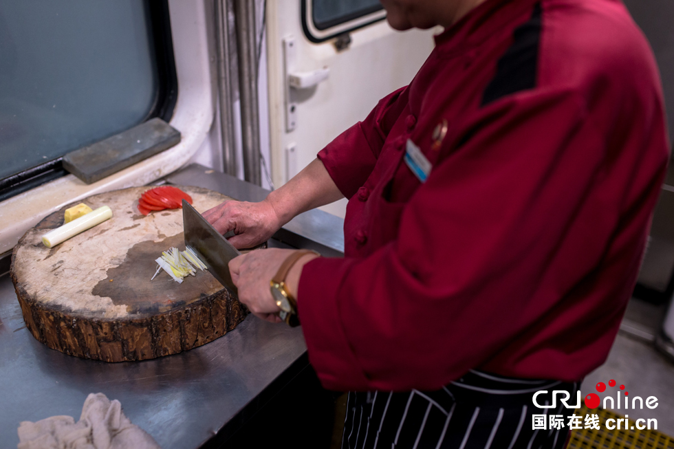 列車上的廚師和一般的餐廳廚師最大的區別在于“晃”,火車在運行中顛簸不斷,“最重要的是腿要分開,站成外八字,扎好馬步,隨著車廂晃動的方向,這樣才能穩當。”白師傅說。