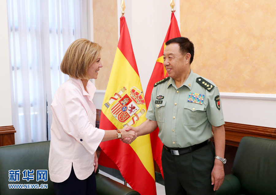 6月13日,中央軍委副主席范長(zhǎng)龍(右)在馬德里會(huì)見西班牙國(guó)防大臣德科斯佩達(dá)爾。 新華社發(fā)(李曉偉攝)