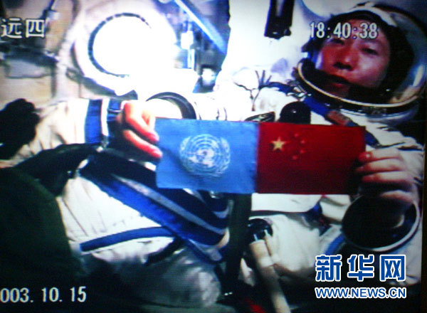 北京時(shí)間2003年10月15日18時(shí)40分,中國(guó)培養(yǎng)的第一位航天員楊利偉從太空向世界各國(guó)人民問(wèn)好,并在艙內(nèi)并列展示了五星紅旗和聯(lián)合國(guó)旗(資料照片,攝于北京航天指揮控制中心大屏幕)。新華社發(fā)