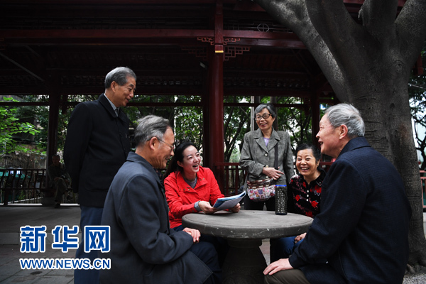10月10日,重慶市南岸區南坪街道南湖社區黨委書記張琦(左三)和社區居民一起聊家常。 新華社記者 王全超 攝