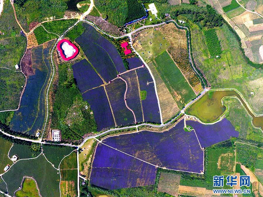 這是5月26日航拍的廣西忻城縣薰衣草莊園。通過農(nóng)業(yè)、文化、旅游的深度融合,從農(nóng)業(yè)供給側(cè)改革上精準(zhǔn)發(fā)力,忻城走出了一條以農(nóng)業(yè)產(chǎn)業(yè)創(chuàng)新帶動第三產(chǎn)業(yè)發(fā)展的道路。新華社記者 黃孝邦 攝