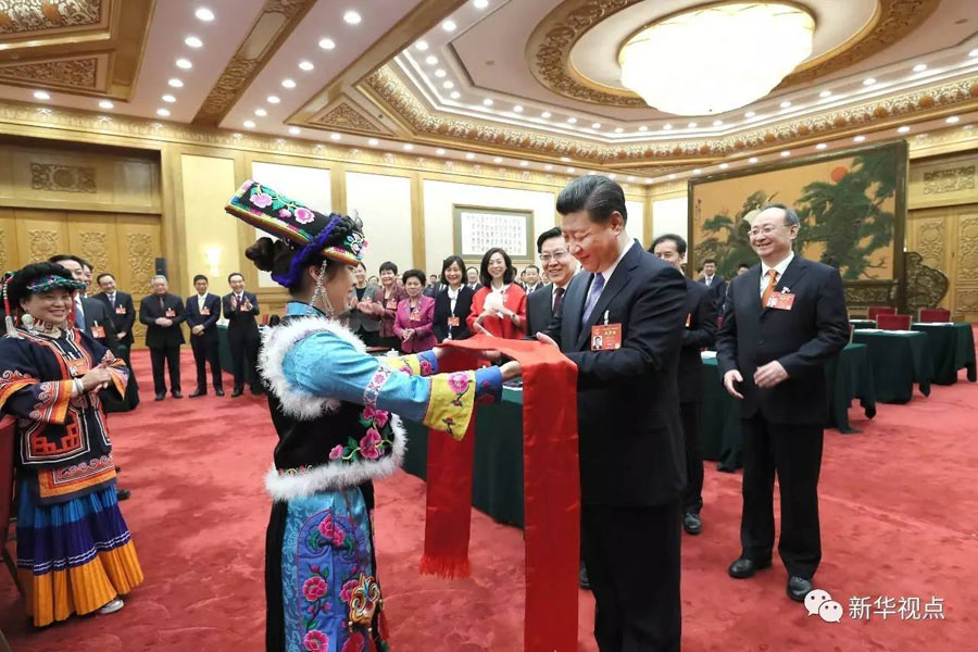 四川是一個多民族聚居的省份。習近平走進會場時,身著民族服裝的藏族、彝族、羌族代表向總書記問好。藏族、羌族代表分別獻上了潔白的哈達和鮮艷的羌紅,表達對總書記的敬意,祝福中華民族繁榮昌盛。習近平請他們轉達對各族同胞的祝福。