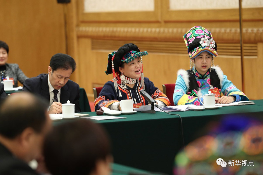 審議中,彝族女代表駱云蓮給總書記看了幾張照片,總書記也很開心。