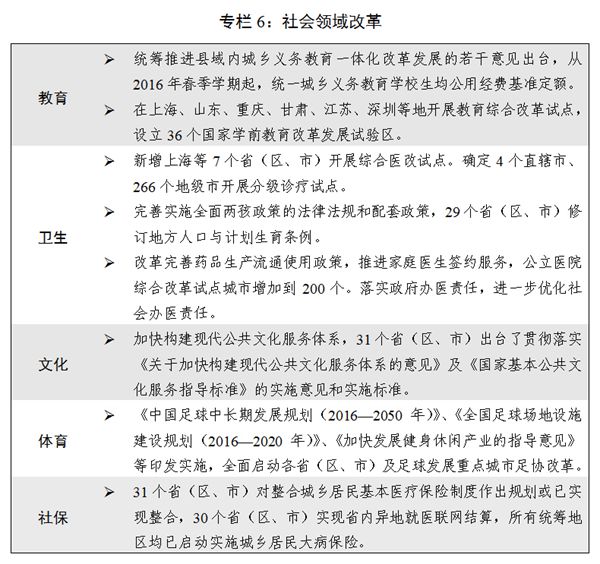 七是社會領域改革加快推進。中央和國家機關公務用車制度改革全面完成,地方黨政機關公車改革深入推進。行業協會商會與行政機關脫鉤改革第二批試點啟動實施。加快不動產統一登記制度落地,全國100%的地(市、州)、98%的縣(市、區)實現“發新停舊”。國家科技計劃管理改革繼續深化,以增加知識價值為導向的分配政策出臺,科技成果轉化力度加大。教育領域綜合改革向縱深推進。分級診療制度建設持續推進,城鄉居民基本醫療保險制度整合取得實質性進展,個人衛生支出占衛生總費用的比重下降到28.9%。《國務院辦公廳關于全面放開養老服務市場提升養老服務質量的若干意見》(國辦發〔2016〕91號)印發實施。穩步推進機關事業單位養老保險制度改革。加快構建中國特色哲學社會科學,實施哲學社會科學創新工程。足球改革加快推進。