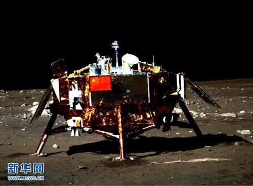 資料圖:嫦娥三號(hào)著陸器及器載五星紅旗圖片。該圖是由月球車上全景相機(jī)拍攝的。新華社發(fā)(國(guó)防科工局供圖) 圖片來(lái)源:新華網(wǎng)
