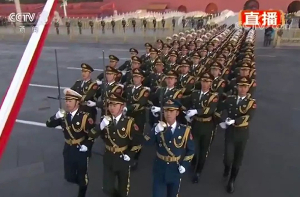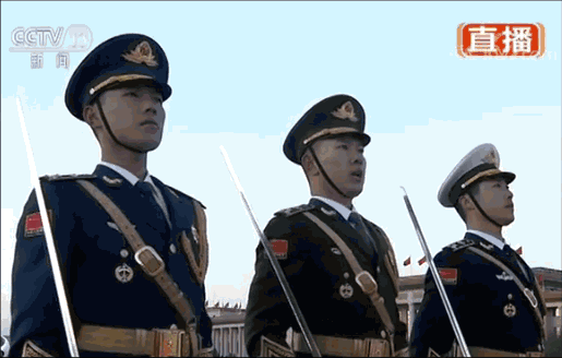 走在國旗手與護(hù)旗隊(duì)中間的分隊(duì)長,此次從一名增加到了三名,他們分別身著陸海空軍禮服,配掛指揮刀,代表解放軍全軍,負(fù)責(zé)發(fā)出升國旗口令。