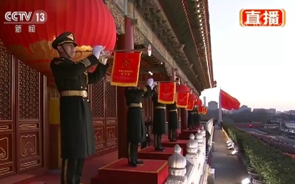 由軍樂團(tuán)八名禮號(hào)手在天安門城樓演奏《升旗號(hào)角》音樂,增加了升旗儀式的神圣感與儀式感。八名禮號(hào)手經(jīng)過嚴(yán)格挑選,從技術(shù)到體貌都是最優(yōu)秀的,未來一年基本不會(huì)輪換。