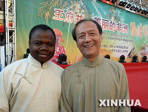 資料圖片:2006年10月31日,中國相聲演員丁廣泉(右)和他的非洲徒弟在王府井步行街參加非洲風情節活動時合影。