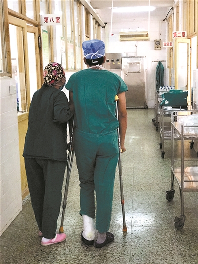 打著石膏拄著拐杖做手術 他說:“病人多醫(yī)生少,能做就做吧”