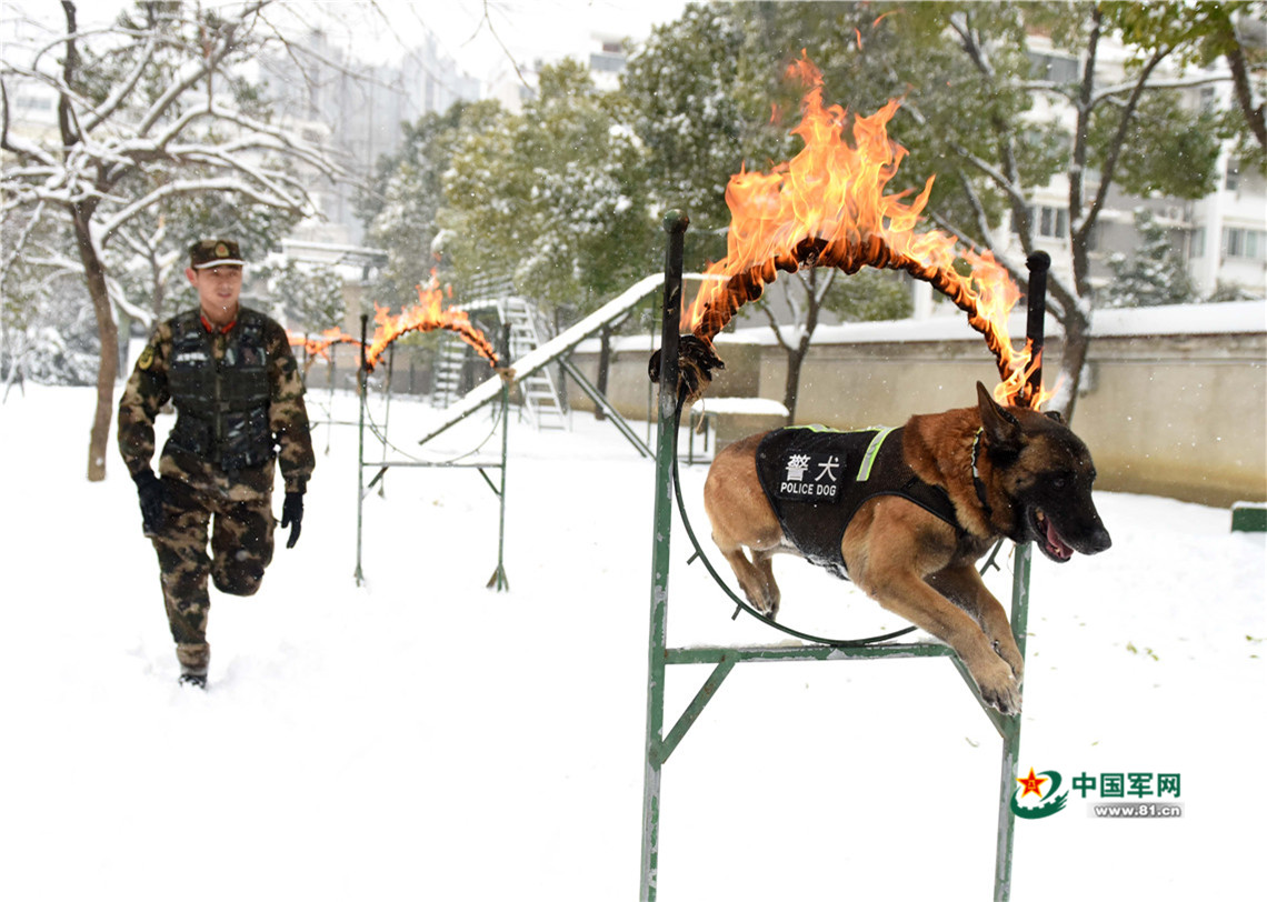 1月27日,武警安徽總隊(duì)機(jī)動(dòng)支隊(duì)警犬班班長(zhǎng)王營(yíng)廣帶領(lǐng)警犬“魯克”進(jìn)行穿越火圈訓(xùn)練。