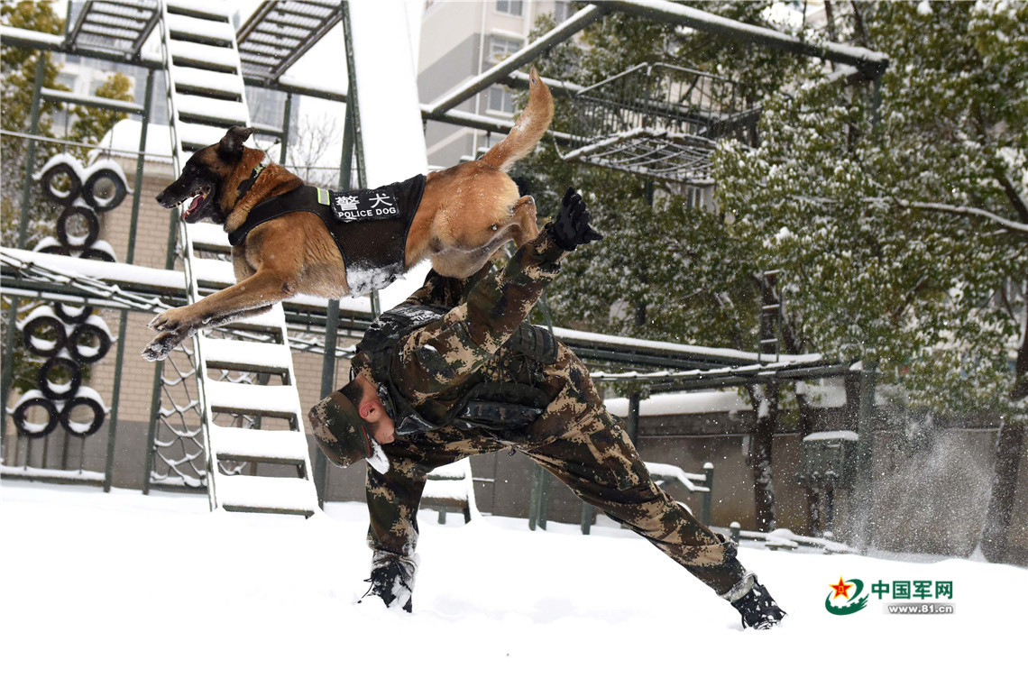 1月27日,武警安徽總隊(duì)機(jī)動(dòng)支隊(duì)警犬班班長王營廣與警犬“魯克”進(jìn)行人犬結(jié)合訓(xùn)練。