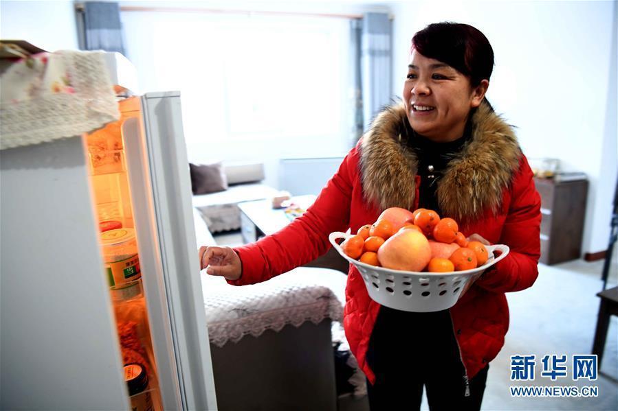 盧氏縣東明鎮小灣村貧困戶趙愛文在新搬遷的家里從冰箱取水果招待客人(2月1日攝)。新華社記者朱祥 攝