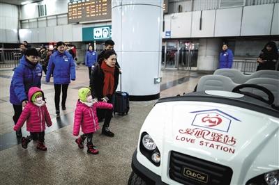 愛心扶助員幫助帶孩子的乘客乘坐愛心驛站電瓶車前往出租車等候區。