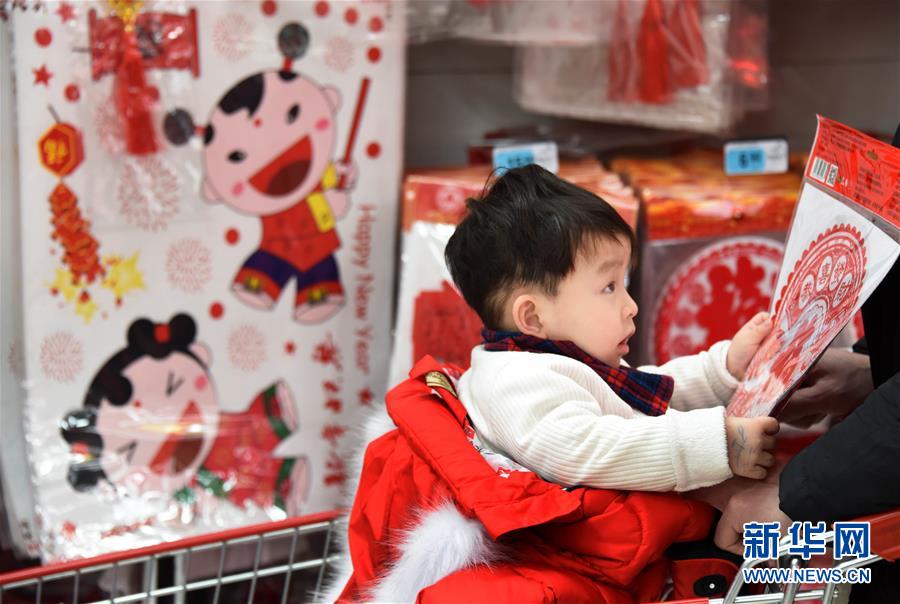 一名小男孩陪家長在青島一家商場挑選“福”字(2月10日攝)。新華社記者 李紫恒 攝