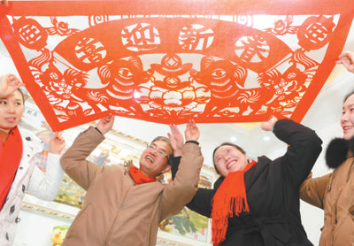 圖二 2月15日,在安徽省阜陽(yáng)市臨泉路白衣橋安置區(qū)內(nèi),安置戶(hù)董杰珍(前一)和當(dāng)?shù)丶艏埶囆g(shù)家一起將喜慶窗花張貼到窗戶(hù)上。王彪 攝(人民視覺(jué))