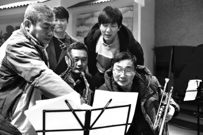 在馬莊村文化禮堂,農民樂團的成員在排練時討論樂譜。新華社發