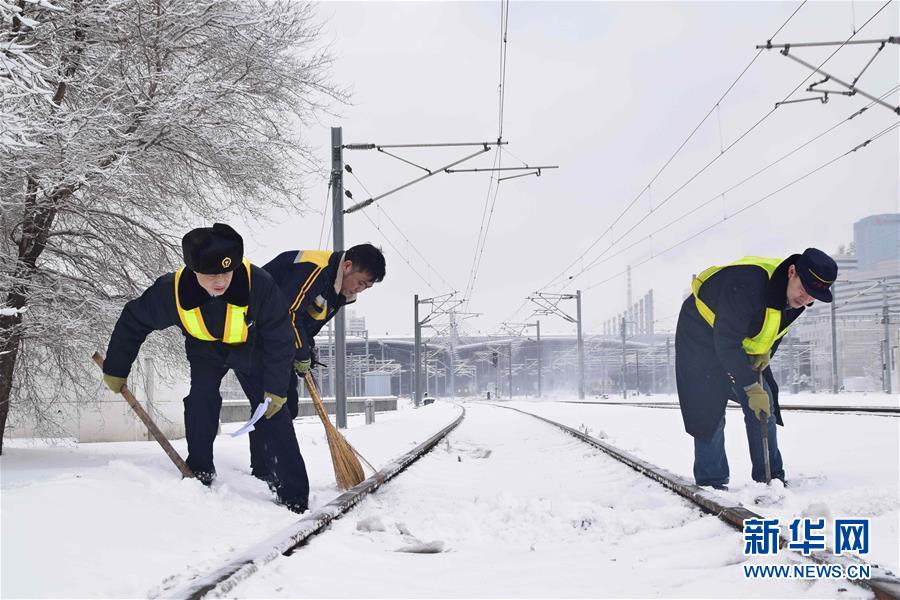 3月15日,沈陽(yáng)北站的工作人員在清理鐵軌上的積雪。當(dāng)日,沈陽(yáng)降落春雪。新華社發(fā)(龍雷攝)