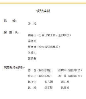 此外,擔(dān)任副院長的有曲青山(分管日常工作,正部長級)、吳德剛、賈高建(中央編譯局局長)、孫業(yè)禮、陳揚(yáng)勇,院務(wù)委員會委員分別有陳晉(副部長級)、張樹軍(副部長級)、張宏志(副部長級)、馮俊(副部長級)、魏海生、柴方國、徐永軍、陳理、季正聚、陳維義。