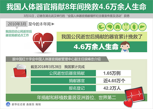 據(jù)中國(guó)紅十字會(huì)中國(guó)人體器官捐獻(xiàn)管理中心副主任侯峰忠介紹,截至今年3月28日,我國(guó)已累計(jì)完成公民逝世后器官捐獻(xiàn)達(dá)1.65萬(wàn)例,捐獻(xiàn)器官近4.65萬(wàn)個(gè),累計(jì)報(bào)名登記42.2萬(wàn)人,年捐獻(xiàn)和移植數(shù)量居亞洲首位、世界第二。