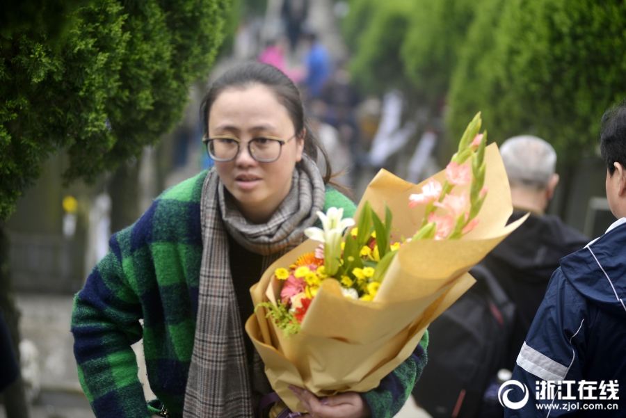 4月5日清明節上午,前往浙江省定舟山市定海區清陵掃墓人絡繹不絕,不少掃墓人用鮮花祭祀,寄托哀思懷念逝去的親人,倡導環保綠色的清明。(浙江在線拍友 胡社友 攝)