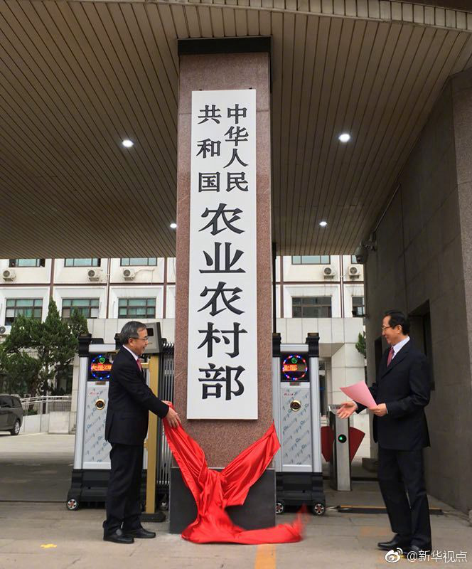 新組建的農(nóng)業(yè)農(nóng)村部4月3日正式掛牌。韓長賦任部長、黨組書記。(新華社“新華視點(diǎn)”微博 記者 董峻)