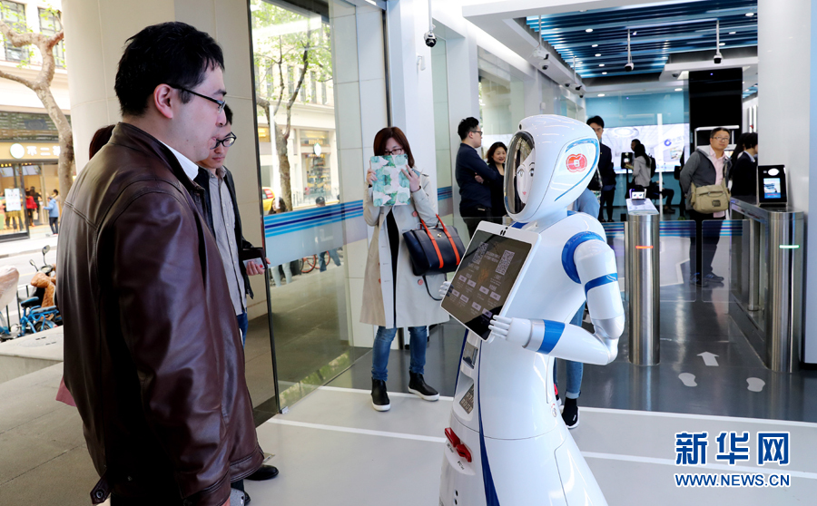 一位市民在位于上海九江路的無人銀行入口處向迎賓機器人說明需要辦理的業務種類(4月12日攝)。近日,中國建設銀行在上海九江路開出國內首家無人銀行。新華社記者 方喆 攝