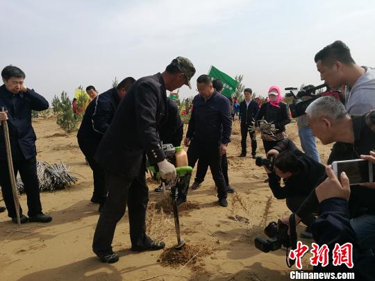 圖為在庫布其沙漠上舉行的“大型義務植樹活動”現場。李愛平 攝