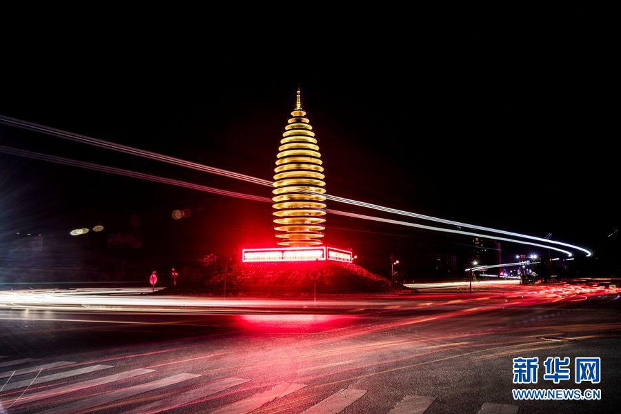 夜幕中容城縣地標建筑容和塔,大車車頂燈駛向奧威路后,在夜空留下一道絢麗的光。中國雄安官網記者 王永康 攝