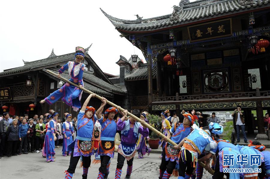 演員在汶川縣水磨鎮(zhèn)萬年臺進行民俗表演(2012年5月23日攝)。新華社發(fā)(王飛 攝)