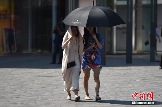 資料圖:北京街頭新人用衣服和傘遮陽。中新網(wǎng)記者 金碩 攝
