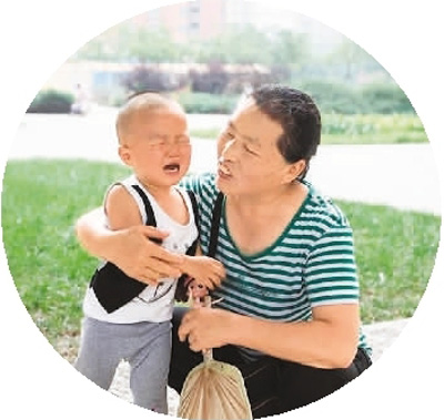 北京某社區內一位隨遷老人正在安慰兩歲多的孫子,孩子因為摔倒啼哭不止。(來源:央廣網)