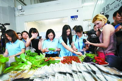 昨天(15日)上午,北京航空航天大學(xué)“月宮一號(hào)”實(shí)驗(yàn)室,為期365+5天的世界上時(shí)間最長的“月宮365”實(shí)驗(yàn)獲得圓滿成功。左圖:4位志愿者從實(shí)驗(yàn)艙走出。上圖:從全密閉實(shí)驗(yàn)艙中帶出的蔬果吸引了眾人的目光。本報(bào)記者 和冠欣攝