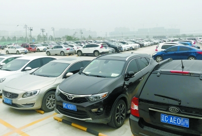 地鐵六號線潞城站外停車場內,外埠牌照汽車約占八成。白繼開 攝