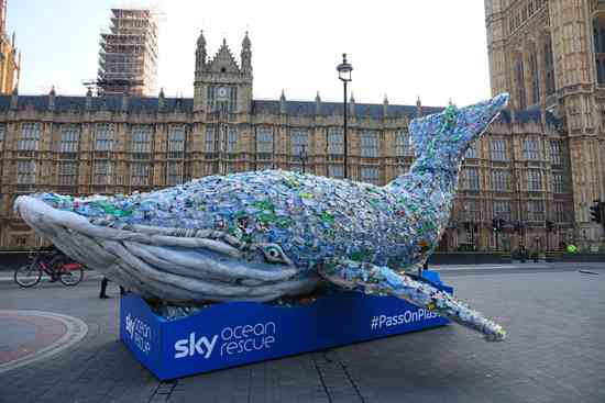 英國會大廈前現巨型塑料鯨魚,呼吁減少海洋垃圾。視覺中國供圖