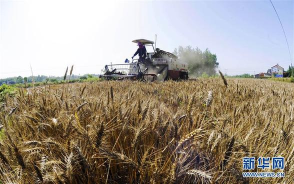 5月23日,在湖北省襄陽市襄城區(qū)尹集鄉(xiāng)尤河村,農(nóng)民駕駛農(nóng)機(jī)收割小麥。新華社發(fā)(安富斌 攝)