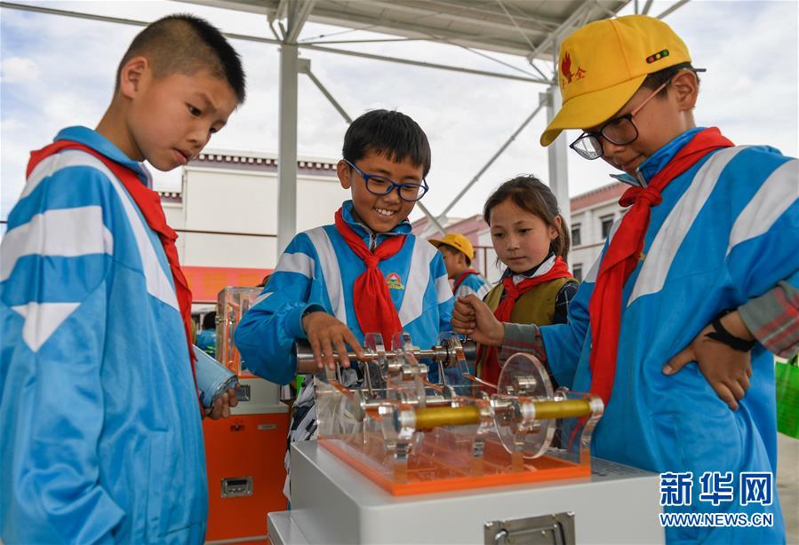 幾名學(xué)生在拉薩市流動科技館巡展活動現(xiàn)場體驗(yàn)科學(xué)小實(shí)驗(yàn)(5月24日攝)。 新華社記者 劉東君 攝