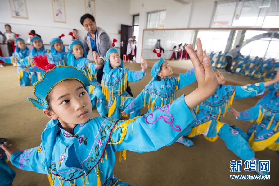 江蘇省南通市海安縣西場小學(xué)學(xué)生在練習(xí)京劇(5月26日攝)。新華社發(fā)(徐勁柏 攝)