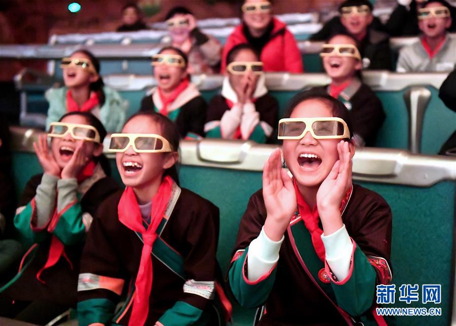 在廣西柳州市景行小學(xué)柳東校區(qū),來自三江侗族自治縣和融安縣大山里的留守兒童觀看3D動畫片(1月4日攝)。當(dāng)日,柳州市舉行關(guān)愛留守兒童城市圓夢活動。新華社發(fā)(黎寒池 攝)