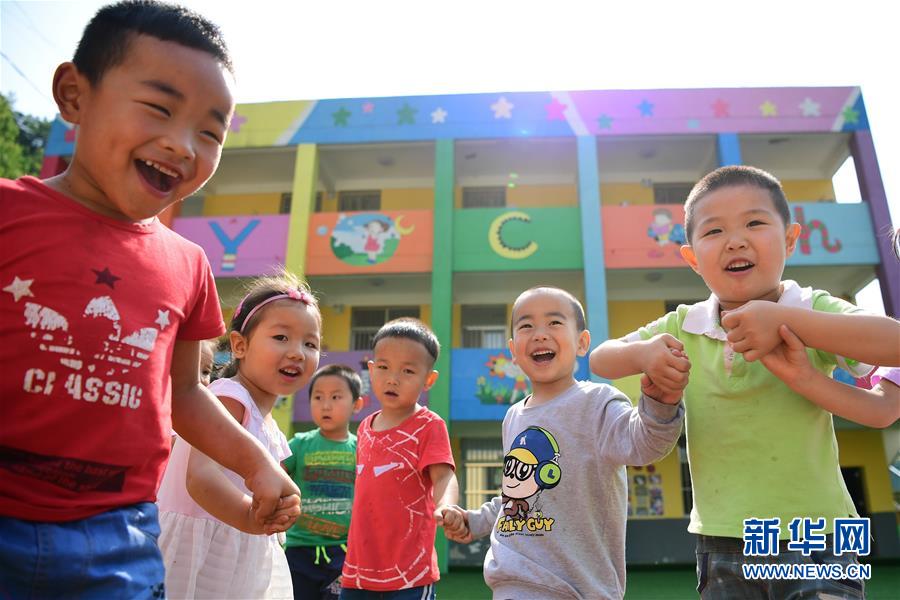 陜西省安康市漢濱區(qū)雙龍鎮(zhèn)杜壩村五四小學(xué)附設(shè)幼兒園小朋友們在操場上做游戲(2017年6月16日攝)。這個(gè)幼兒園使用貸款資金翻修改造而成,有效解決了該村及周邊兒童學(xué)前教育缺失的問題。新華社記者 邵瑞 攝