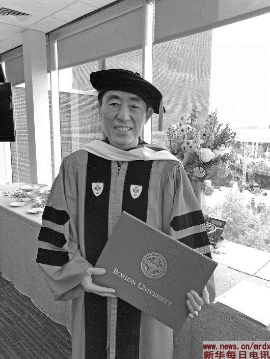 手持波士頓大學(xué)榮譽(yù)博士學(xué)位證書的張藝謀導(dǎo)演。攝影:本報(bào)記者 董丁