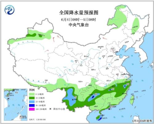 6月3日08時至4日08時,新疆中北部、青藏高原中東部、甘肅南部、西南地區大部、江南中南部、華南大部等地有小到中雨,西南地區東部和南部、華南北部和中部等地的局地有大雨或暴雨(100~120毫米),上述局部地區將伴有短時強降水等強對流天氣。新疆北部、內蒙古東部、華北西部等地的部分地區有4~6級風,其中北疆山口地區陣風可達9~10級。南海中南部等地將有6-8級大風,陣風9級。