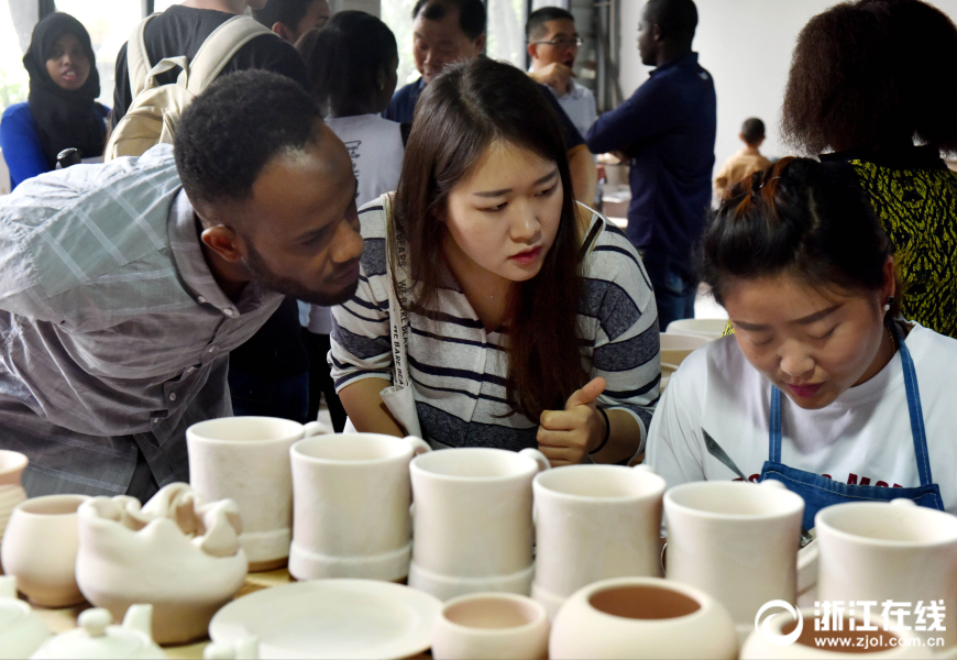 2018年6月3日,來自30多個(gè)國(guó)家的70多名留學(xué)生,在武義漢坊婺窯認(rèn)真學(xué)習(xí)修坯、上釉等環(huán)節(jié)。
